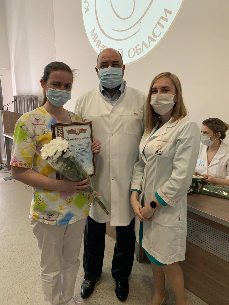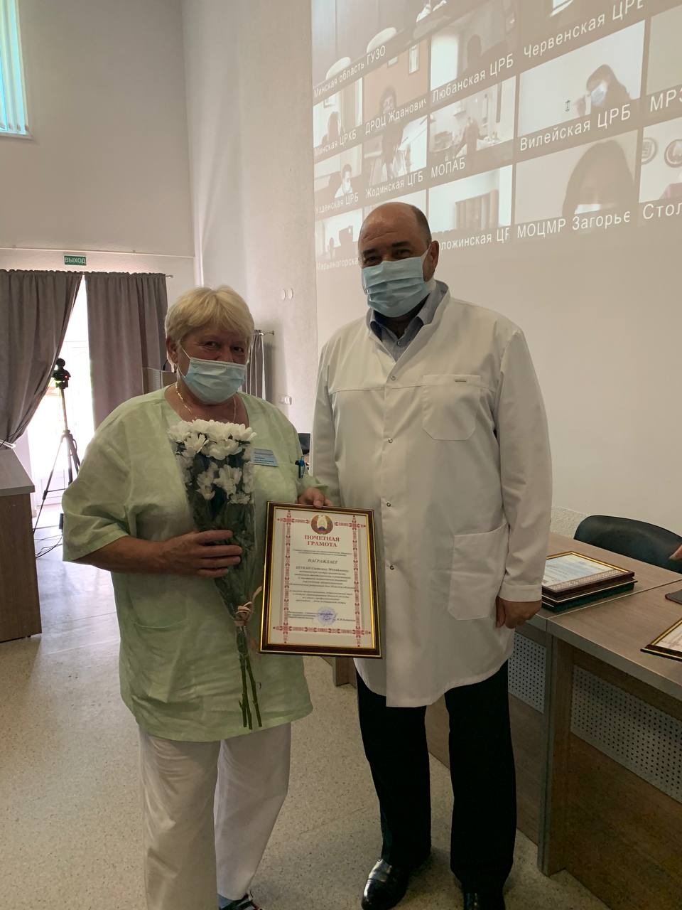 В связи с эпидемиологической обстановкой представители главного управлением по здравоохранению Минского облисполкома и Минского областным комитетом Белорусского профсоюза работников здравоохранения поздравили присутствующих в режиме видеоконференции