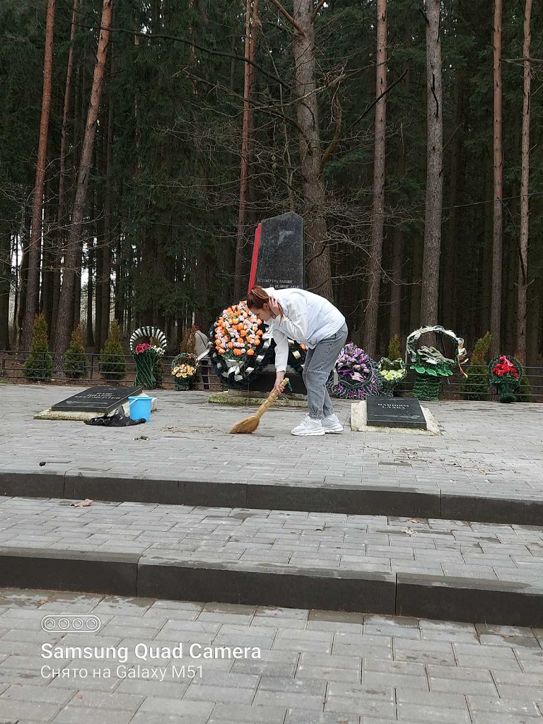 Молодежь, активно принявшись за дело, убрала сухую листву, ветки, мусор, подмели плиты возле памятника-могилы воинам Великой Отечественной войны, расположенного на территории аг. Лесной, и напоминает нам о лётчиках и солдатах, погибшим в 1941-ом году.