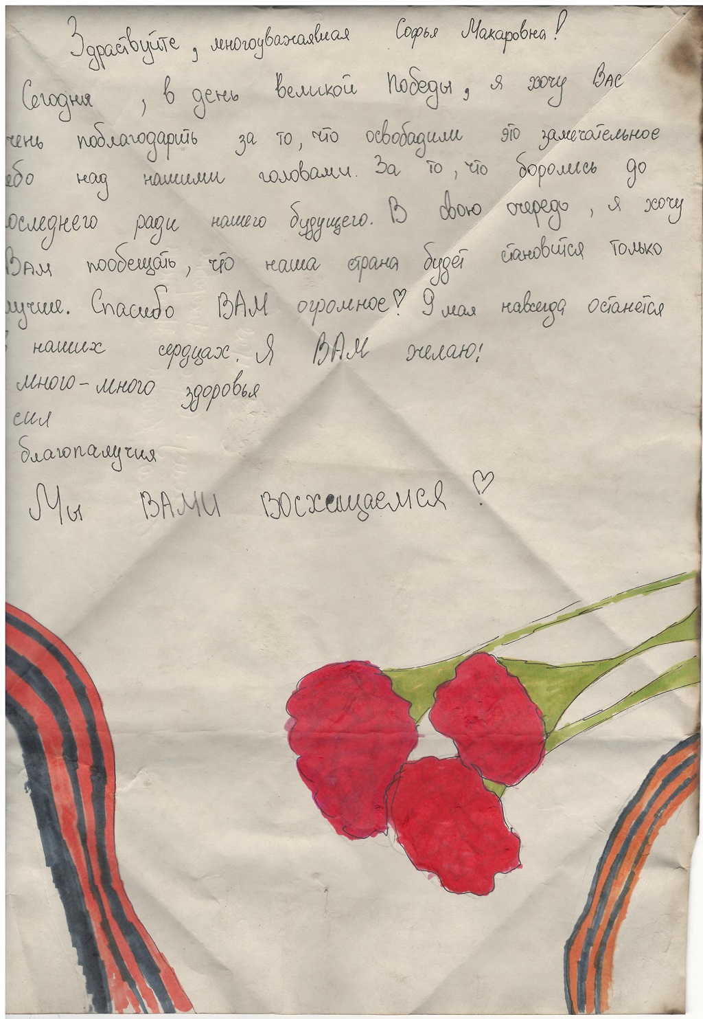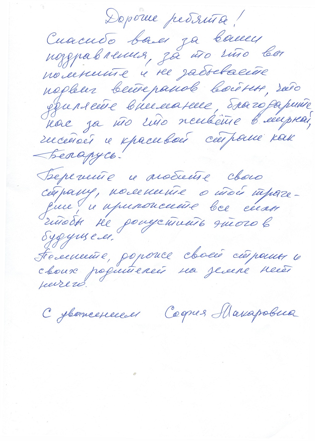 В канун Великой Победы, все письма, написанные детской рукой, были переданы Софье Макаровне Бурдак. Софья Макаровна – узник войны, которая в послевоенное время работала санитаркой в Минской областной клинической больнице. Ежегодно, профсоюзный комитет совместно с администрацией МОКБ навещает Софью Макаровну и поздравляет с праздником. И этот год не стал исключением: слова благодарности, пожелание здоровья и материальная поддержка от профкома и администрации.