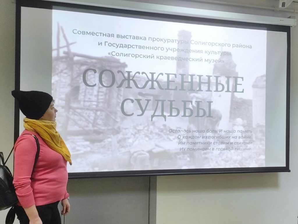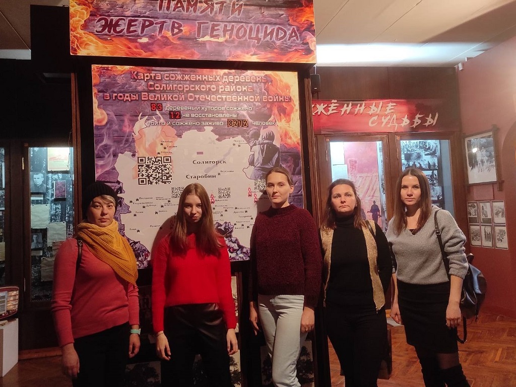 В экспозиционном зале представлена новая выставка «Сожженные судьбы», посвященная геноциду белорусского народа в годы Великой Отечественной войны. Кроме того, вниманию участников мероприятия, были представлены видеоматериалы, собранные корреспондентами Солигорского телевизионного канала в рамках проекта «Спаленыя вёскі Салігоршчыны», благодаря которым молодежь узнала о чудовищных зверствах, которые чинили на мирных землях Солигорщины немецко-фашистские захватчики в феврале 1943 года.