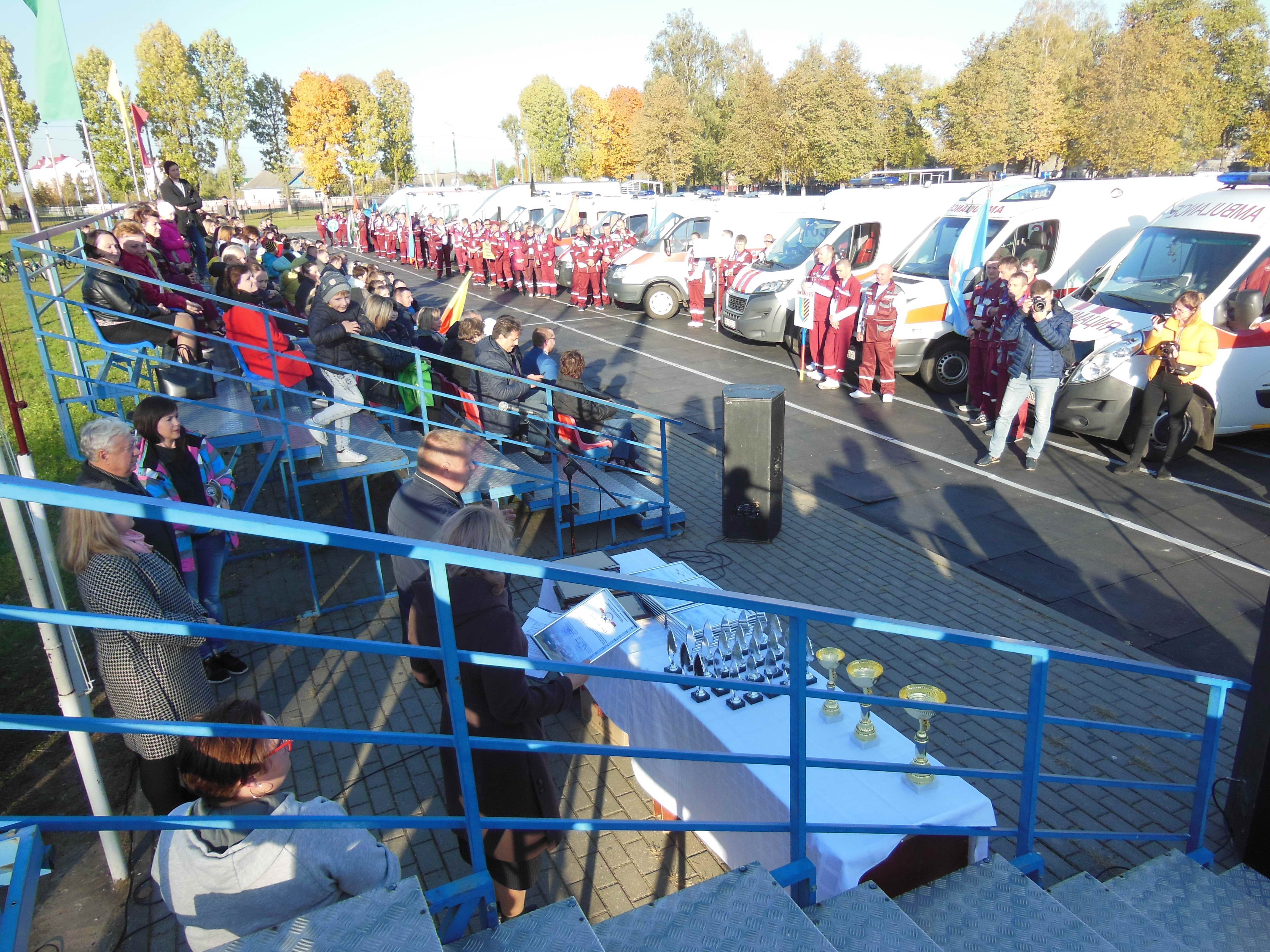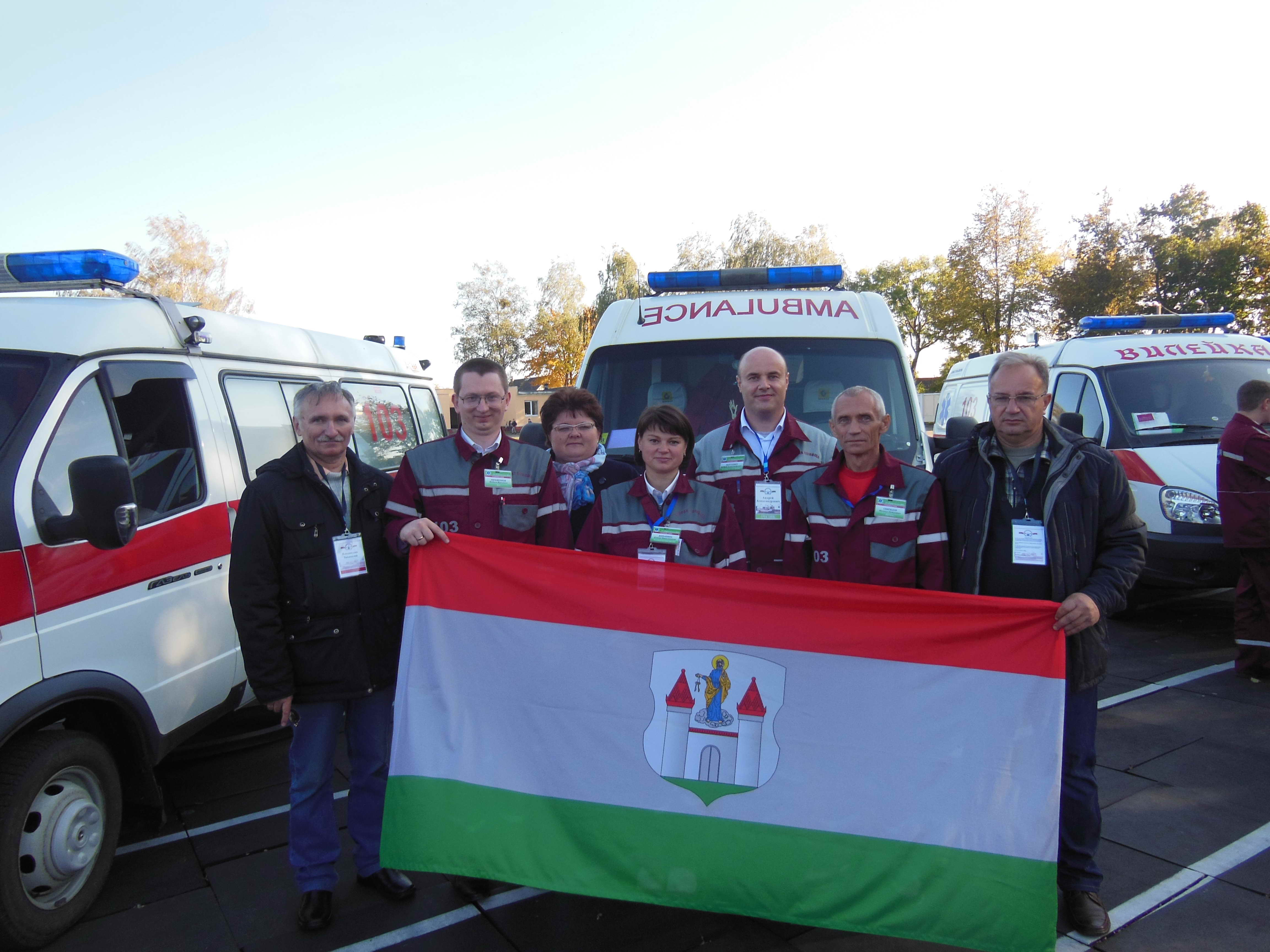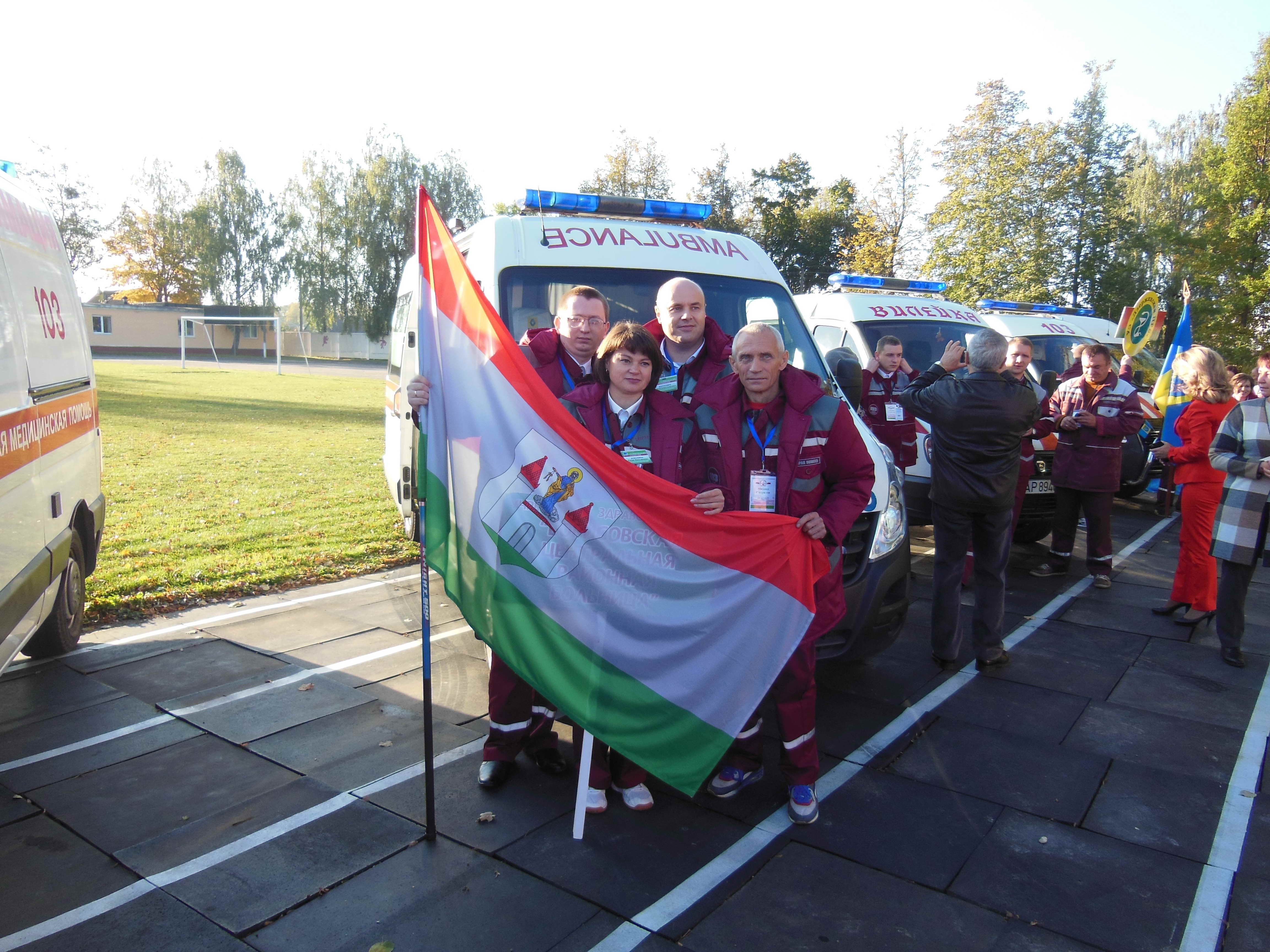 Очень красивым был парад машин станций скорой и неотложной медицинской помощи. Почти все машины шли с флагами своего города или района. По условиям конкурса команды состояли из трех медицинских работников и водителя. Поэтому были различные бригады (фельдшерские и врачебные), задания были так же различные. Борисовскую станцию скорой и неотложной медицинской помощи представляли: молодой, но грамотный врач Абраменков Вадим, опытные фельдшера выездной бригады Даньшина Елена и Матусевич Андрей и водитель Свиридов Михаил.