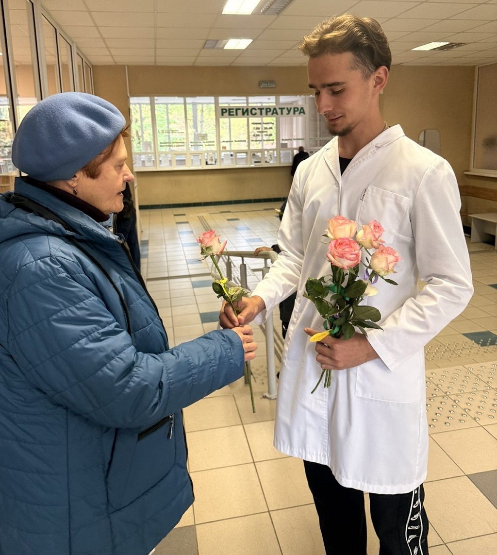 В фойе поликлиники №1 учащиеся дарили цветы всем пожилым пациентам, создавая атмосферу тепла и заботы.