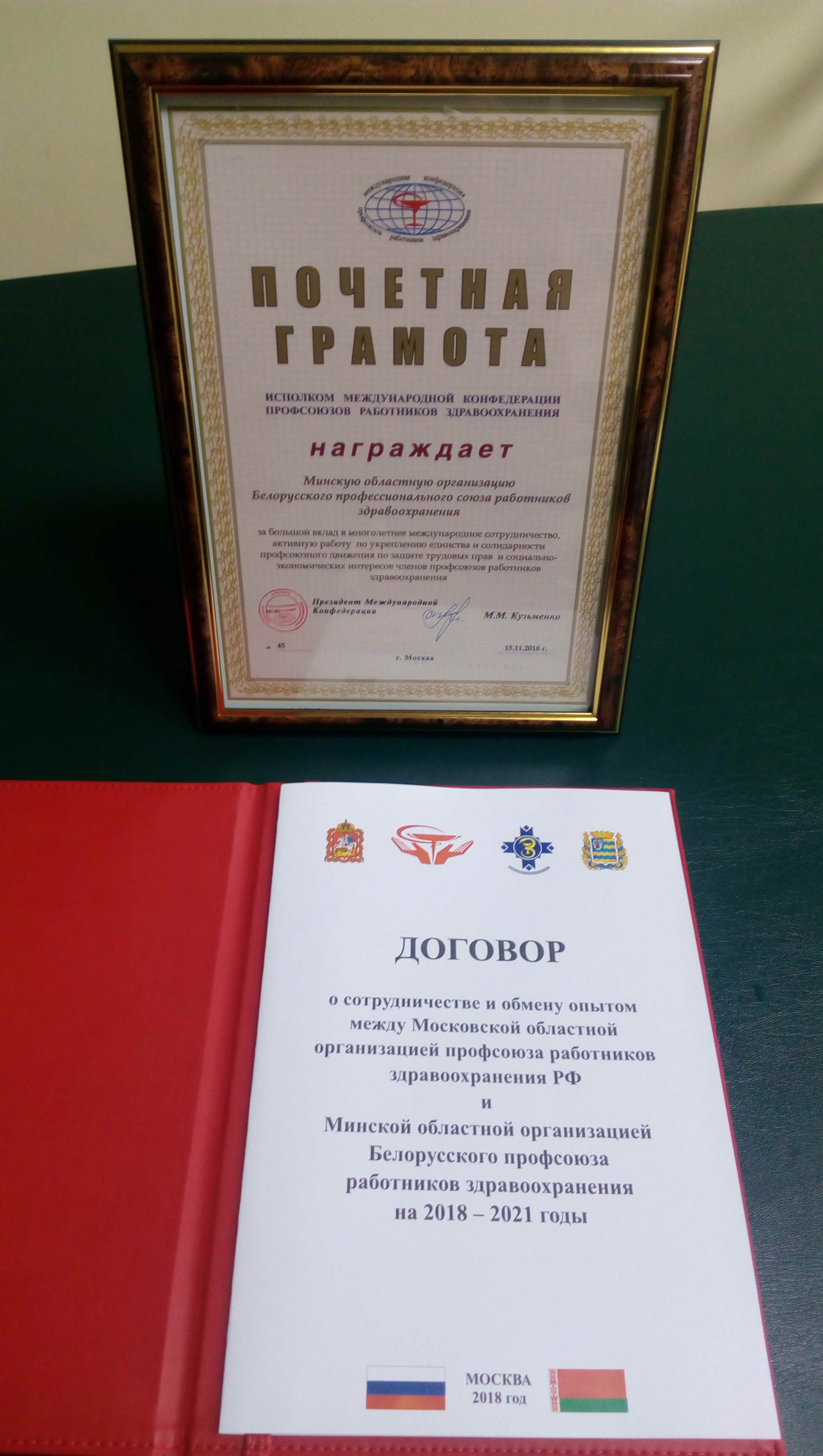 За большой вклад в многолетнее международное сотрудничество, активную работу по укреплению единства и солидарности профсоюзного движения по защите трудовых прав и социально-экономических интересов членов профсоюза работников здравоохранения Минская областная организация Белорусского профессионального союза работников здравоохранения награждена Почетной грамотой Международной конфедерации профсоюзов работников здравоохранения.