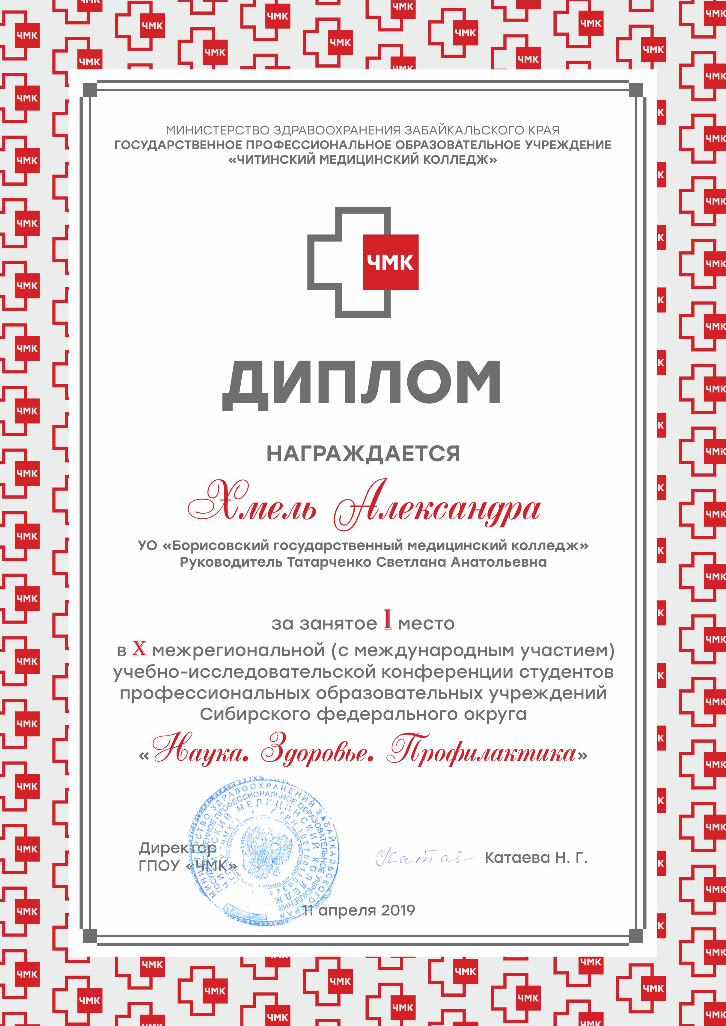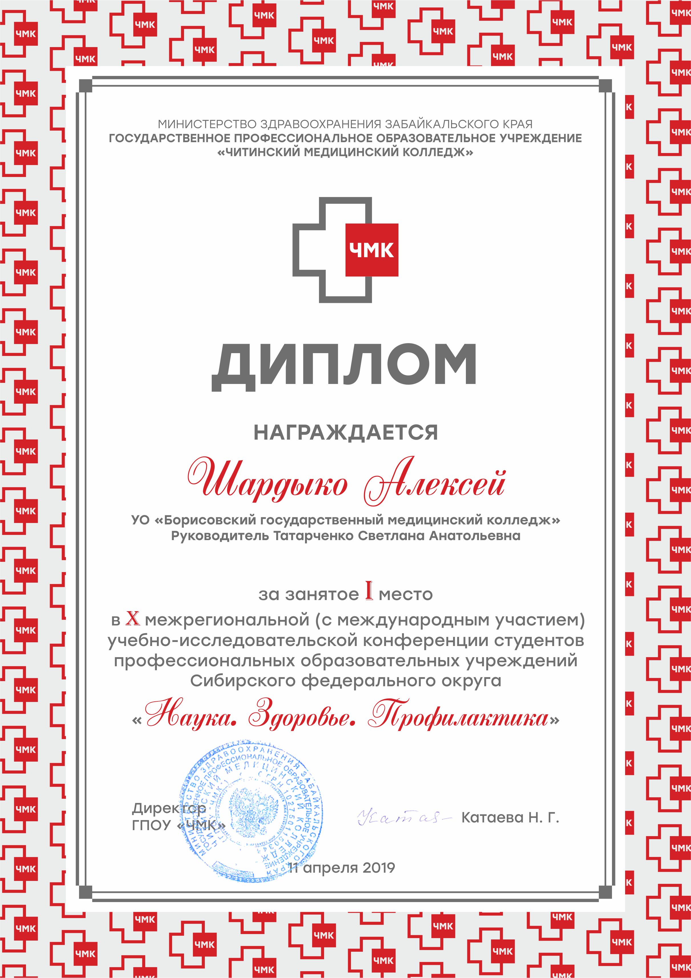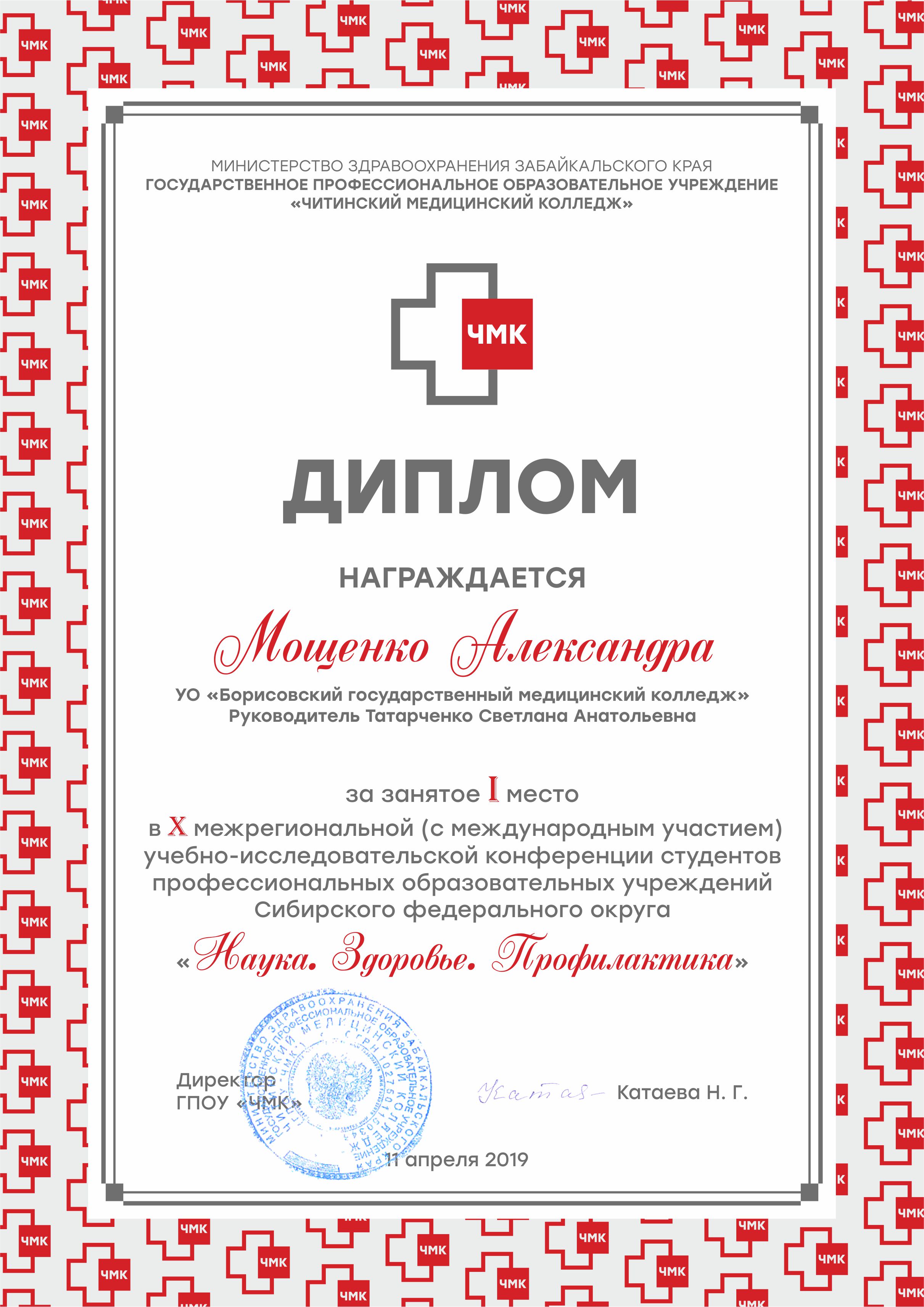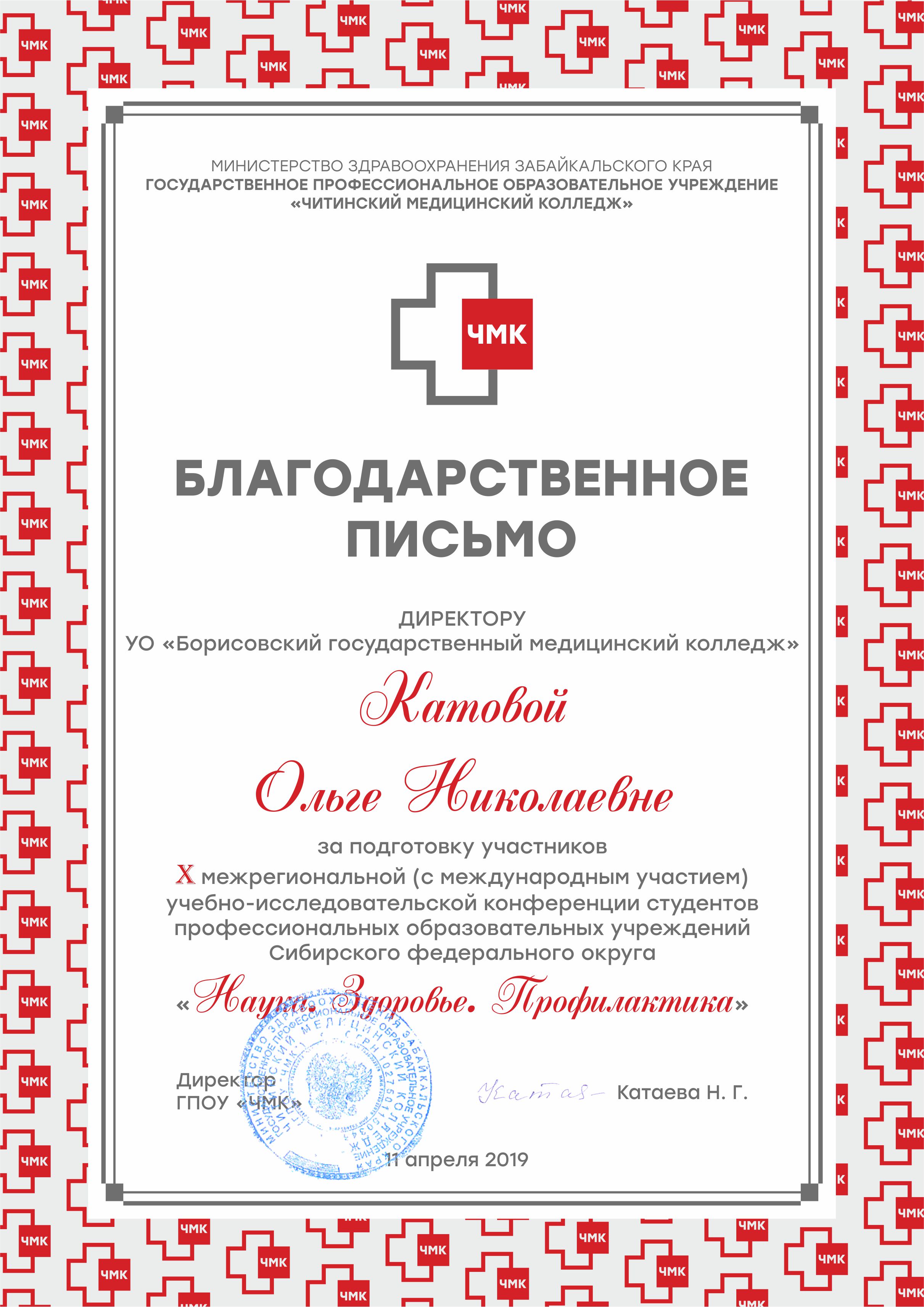 ГПОУ «Читинский медицинский колледж» направил Благодарственное письмо в адрес директора колледжа Катовой О.Н. за высокий уровень организации учебно-исследовательской работы в учреждении образования.