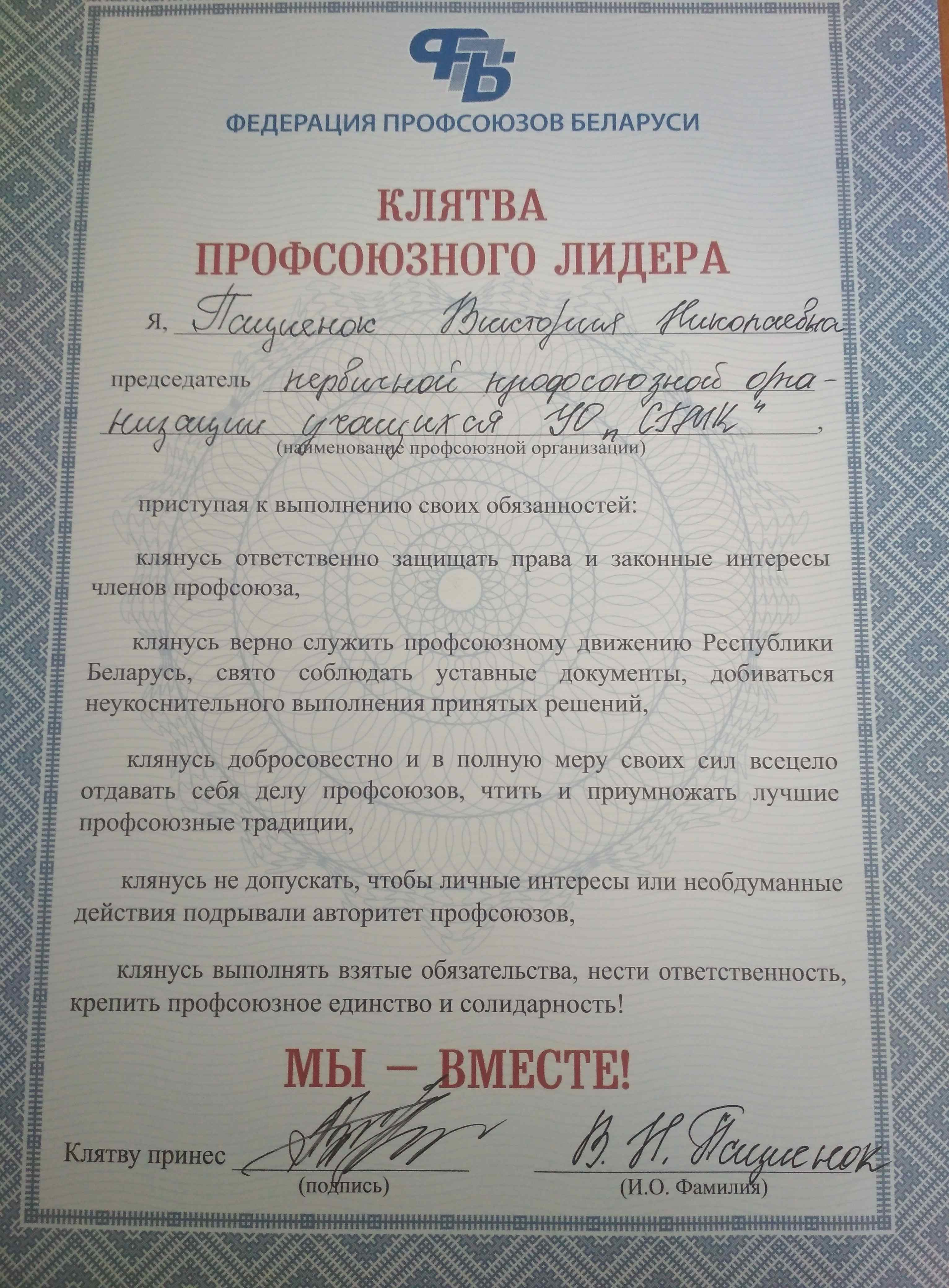 В торжественной обстановке Пациенок В.Н. и Кулеш В.И. вручили благодарности учащимся, за активную позицию в работе первичной профсоюзной организации.