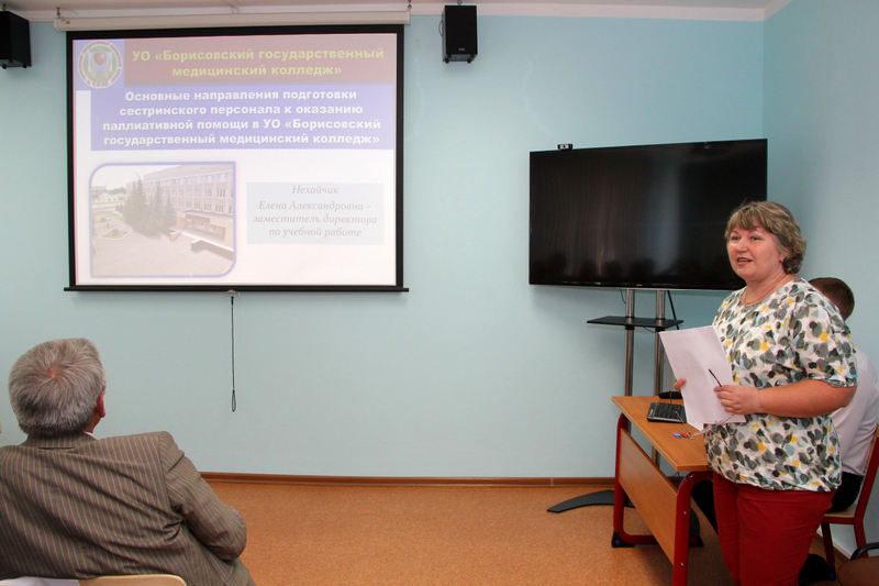 В своем выступлении Елена Александровна отметила: «Необходимо подготовить выпускников к оказанию медико-социальной, психологической и духовной помощи в поддержке паллиативного пациента и его семьи, т.к. в паллиативной медицине специалист вникает в проблемы человека, а не диагноза». Для этого с 2015 года внесены коррективы в систему подготовки специалистов со средним специальным медицинским образованием. Борисовскому медицинскому колледжу была поручена подготовка для республики типовых учебных программ по учебным дисциплинам «Основы паллиативной помощи» (для специальности «Сестринское дело») и «Основы общей онкологии» (для специальностей «Сестринское дело» и «Лечебное дело»). Содержание данных учебных программ направлено не только на обеспечение ухода за пациентами, но и позволяет отработать навыки обучения родственников простейшим медицинским манипуляциям, формирует навыки оказания психологической и духовной поддержки, способствует формированию качественно нового подхода к ценностным жизненным ориентациям, подчеркивает необходимость расширения культурного кругозора.