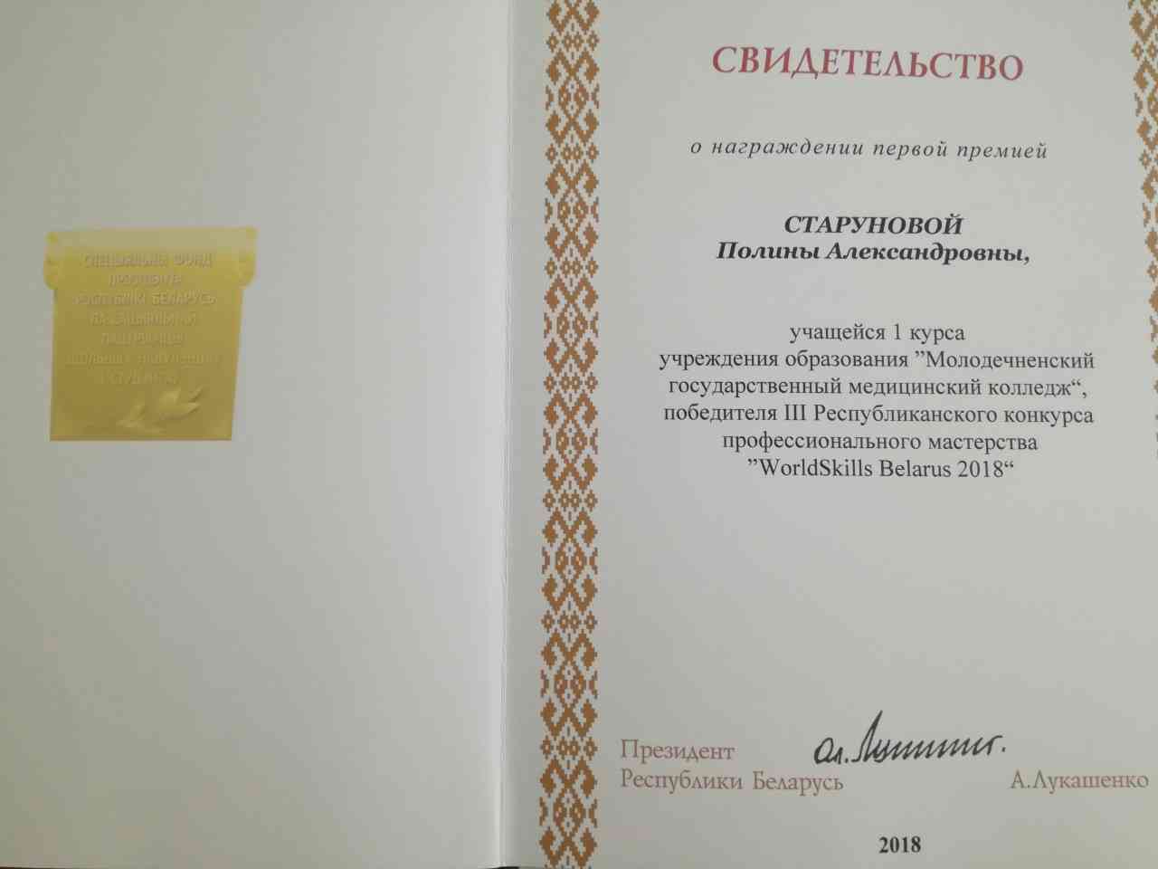 В торжественной обстановке вместе с дипломом «с отличием» выпускнице Старуновой Полине директором колледжа было вручено Свидетельство Специального Фонда Президента Республики Беларусь по социальной поддержке одаренных учащихся и студентов о награждении первой премией как победителя III Республиканского конкурса профессионального мастерства «WorldSkills Belarus 2018».