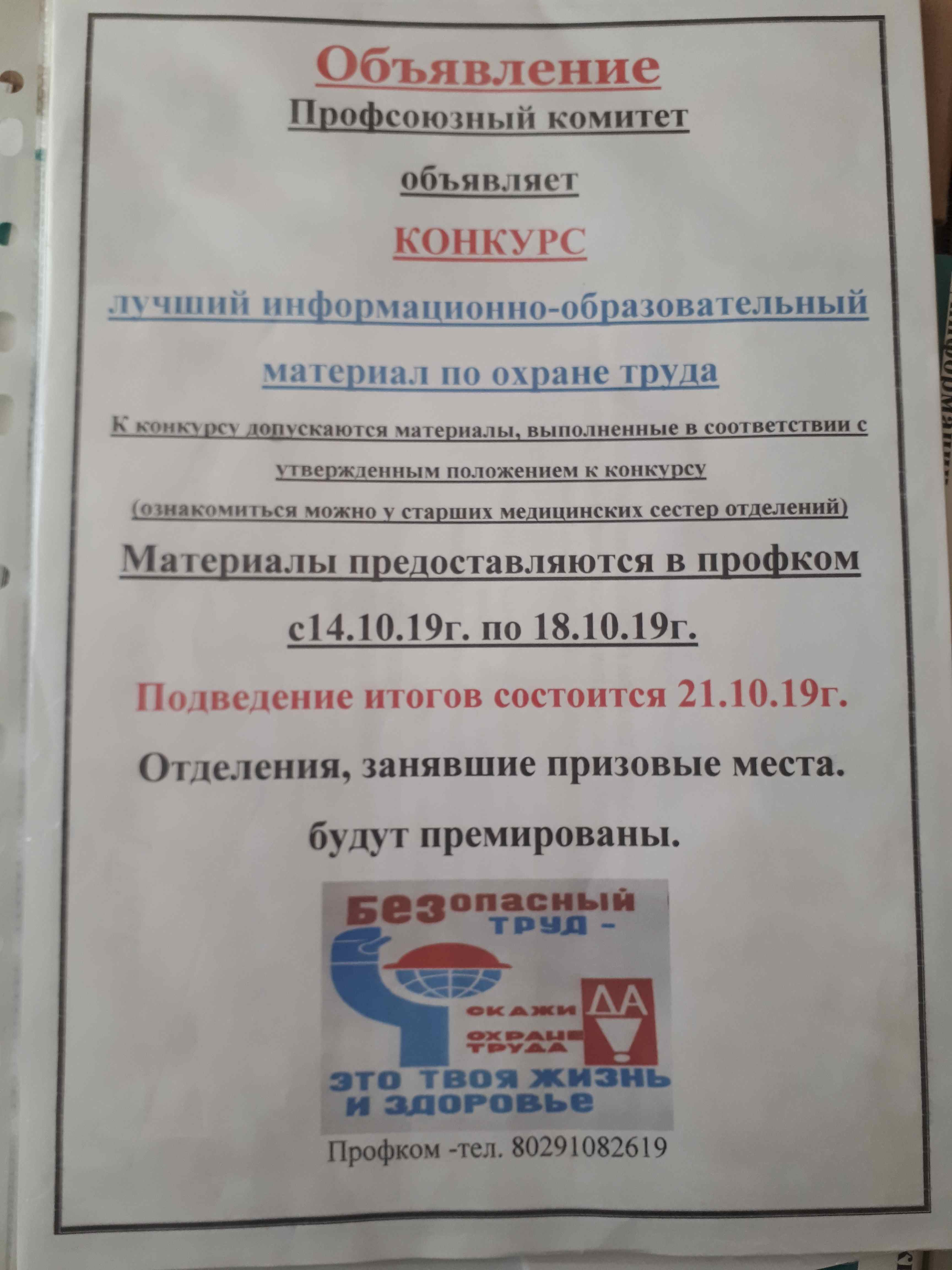 На заседании профсоюзного комитета первичной профсоюзной организации УЗ "Жодинская ЦГБЦ утверждено положение о проведении конкурса среди струтурных подразделений на лучший информационно образовательный материал по охране труда.