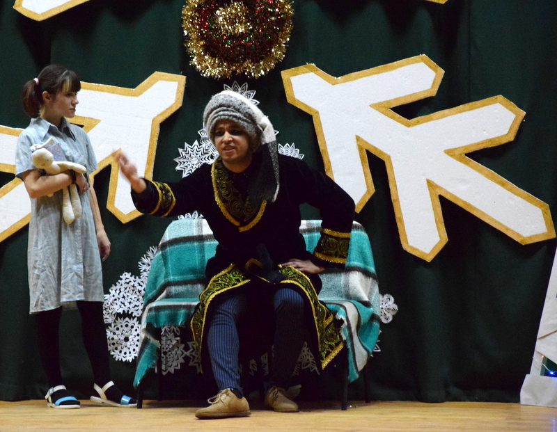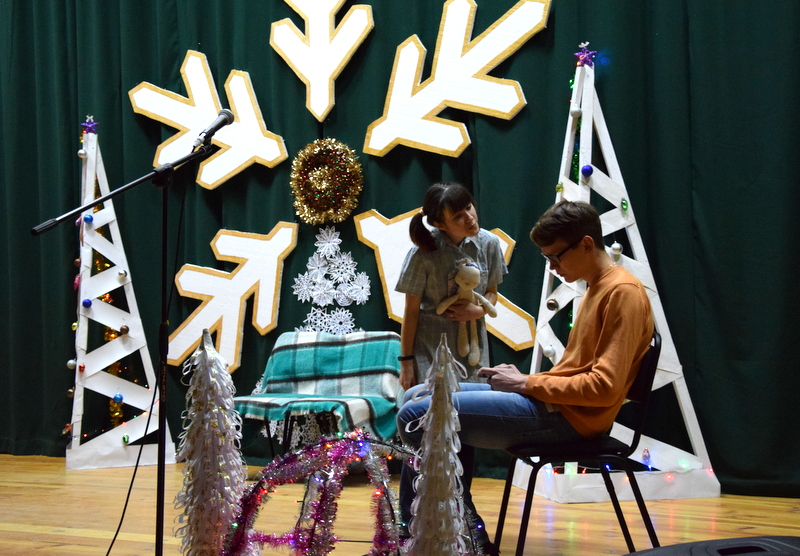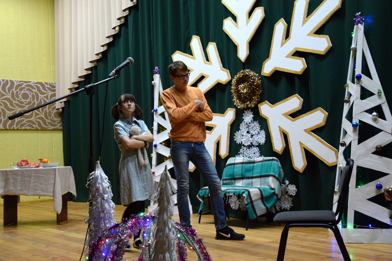 Второй спектакль прошел более успешно. Несмотря на вечернее время, зал был полон. Зрители напряженно следили за историей, разворачивающейся на сцене. Автору пьесы Русиновой Карине (ЛД-174) удалось достучаться до сердца каждого зрителя. Ведь речь шла о семье, о проблемах отчуждения самых близких людей. Режиссеру спектакля Грицук Елене (ЛД-174) удалось заставить зрителя взглянуть на привычную ситуацию в любой семье глазами ребенка, который стремится компенсировать отсутствие внимания, тепла и любви выдуманным миром. В этом мире папин халат превращается в шейха (Абибулаев Тимур, ЛД-172), мамино пальто – в его жену (Бездольник Вячеслав, СД-191), в нем танцуют аборигены (вождь – Виктория Синкевич, ЛД-174), появляются викинг (Владимир Соколов, ЛД-183) и амазонка (Полина Долгополова, ЛД-174), судий (Алексей Ковалёв, ЛД-191) и адвокато (Марта Пронюк, ЛД-174). Девочка Эля (Патрина Евгения, СД-191) увлекает своего старшего брата (Сергей Скакун, ЛД-193) в свои фантазии, заставляет родителей (Телещук Никита, ЛД-194, Мария Лобанова, ЛД-171) вспомнить прошлое и накануне Нового года возродить свои отношения. И, наконец, сказочная Снежная королева (Валентина Ляшкевич, ЛД -174) дарит коробку новогоднего настроения Эле, которая разбивает её и рассыпает Новогоднее настроение на всех присутствующих в зале. Это настроение подхватил и утвердил Дедушка Мороз, сердечно пожелав хорошего Нового года и новогоднего настроения всем присутствующим.
