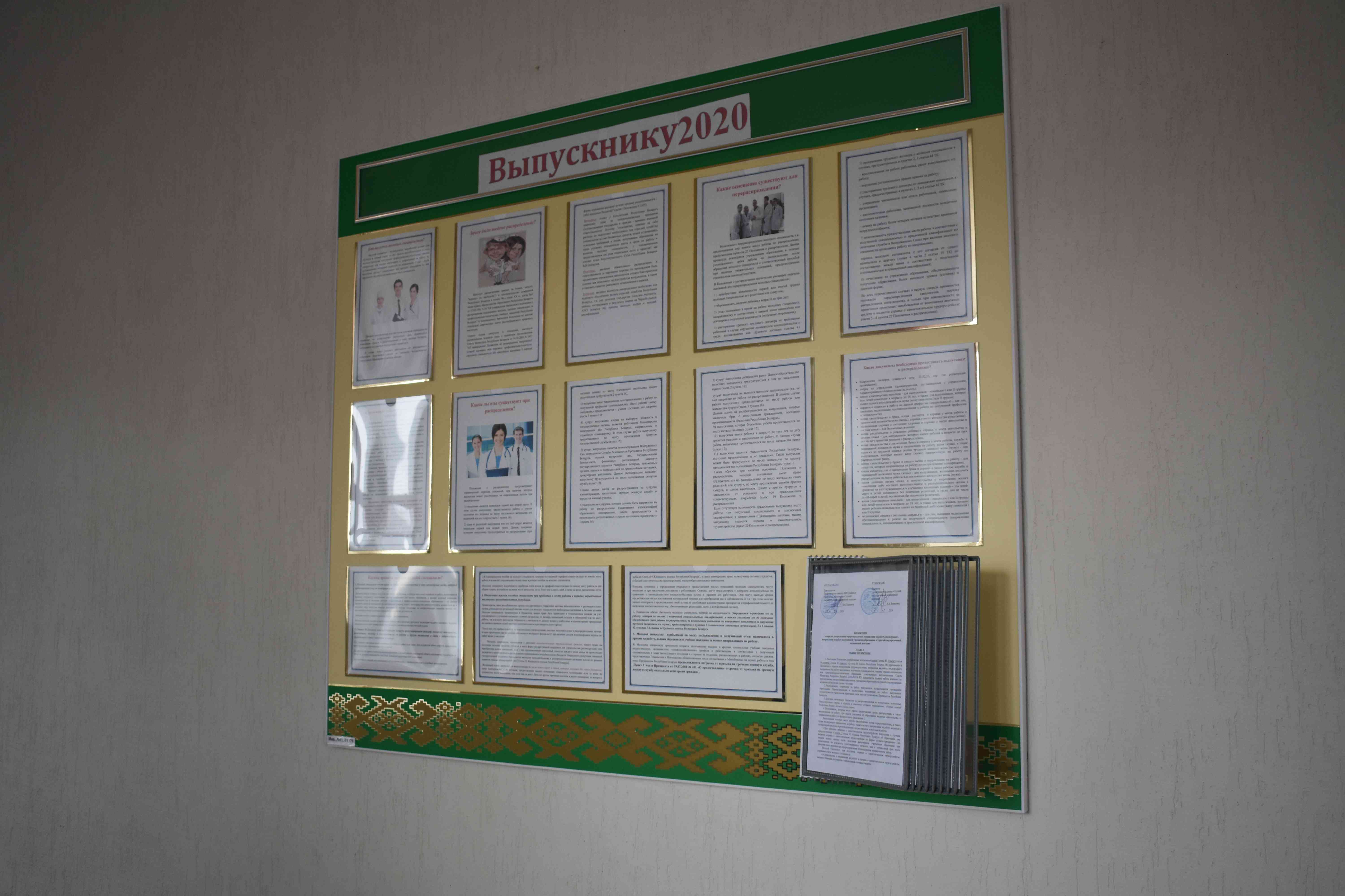 Также профкомом учащихся в холле главного корпуса организован стенд «Выпускнику-2020», на котором размещена информация в следующих рубриках: