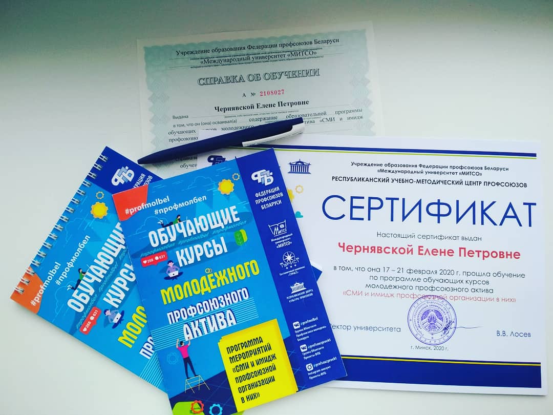 Согласно постановления Президиума Совета Федерации профсоюзов Беларуси от 20 января 2020 г. «Об организации обучающих курсов молодежного профсоюзного актива» с 17 по 21 февраля 2020 года представитель молодежного актива первичной профсоюзной организации УЗ «Молодечненская ЦРБ» Чернявская Елена Петровна, медицинская сестра по обслуживанию детей детской поликлиники, прошла обучение на курсах молодежного профсоюзного актива по теме «СМИ и имидж профсоюзной организации в них». Весь курс, кроме последнего дня, проходил на базе Дома отдыха «Логойский».