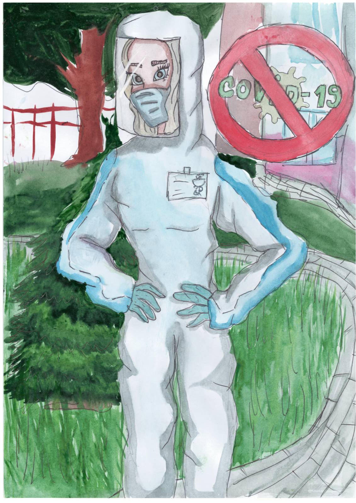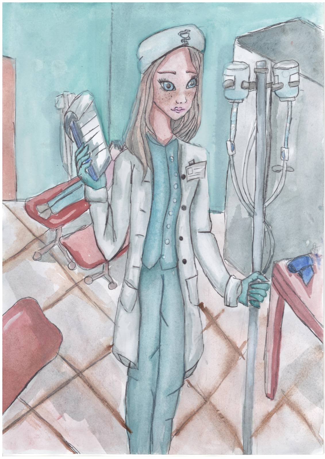 В номинации «На работе» среди участников возрастной группы от 7 до 12 лет первое место заняла Елизавета Крапивко 10 лет. Дочь одного из сотрудников УЗ «Минской областной клинической больницы». Свой рисунок она посвятила маме Наталье. Такой она видит маму на работе, любит и ждёт дома. Её теплые чувства, творческое самовыражение и оригинальность своего стиля не могли не тронут душу и сердца жюри редакции газеты. Даже в таком маленьком возрасте дети понимают важность и суть профессии медицинских работников, особенно, если это медицинская семья.
