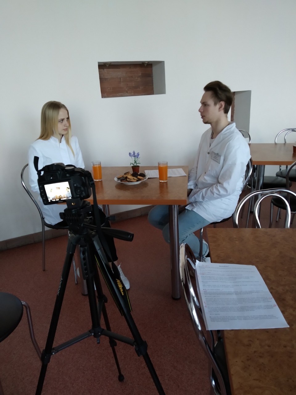 «Перед началом съёмок мы собираемся всей командой, чтобы обсудить сценарий, распределяем слова, вместе решаем, когда ведущие будут в кадре, а какие слова будут за кадром, в каких местах будем снимать тот или иной сюжет. Более детального подхода требуют различные интервью – хотя ребята и преподаватели охотно соглашаются принять участие в съёмках, но приходится сделать не один дубль, чтобы преодолеть волнение, научиться смотреть в камеру и не забывать то, о чём хотели сказать. А вот с Лизой и Владом дела обстоят намного проще – за полгода совместной работы понимаем друг друга с полуслова.»
