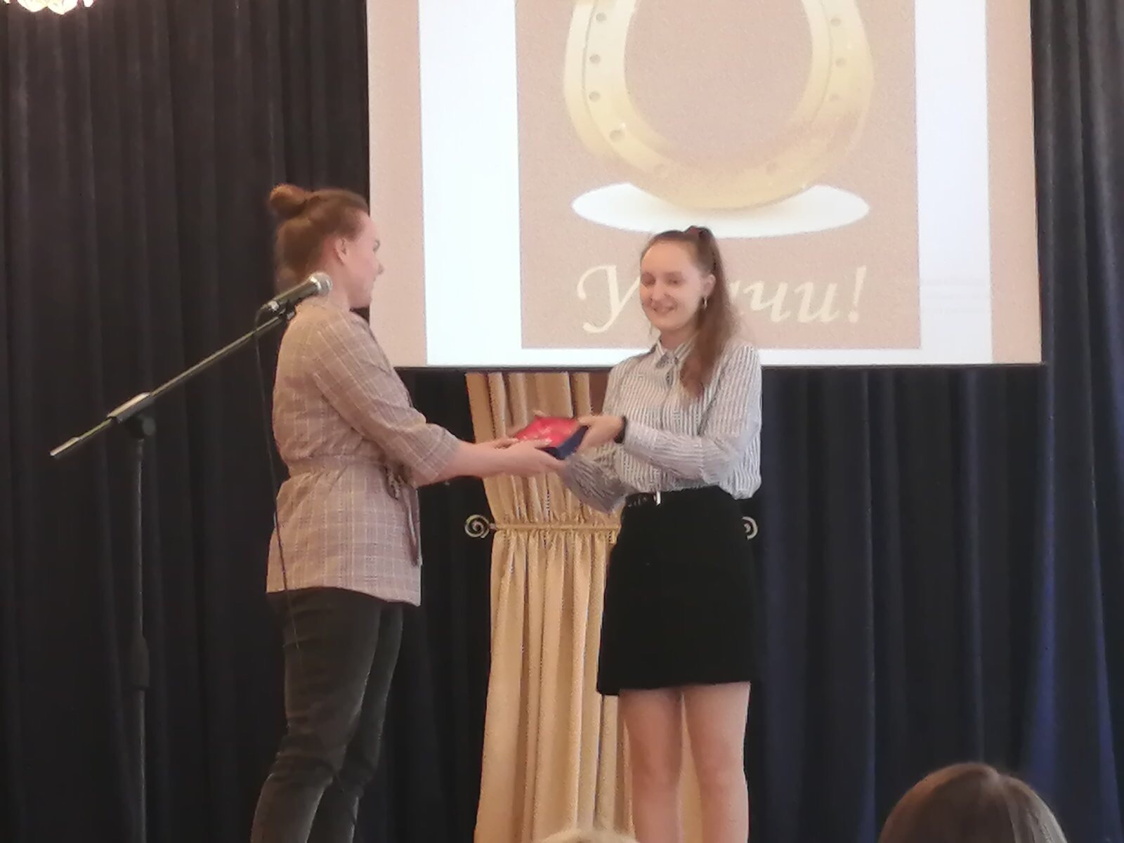 Традиционно состоялась передача символической хрустальной подковы на счастье и успех ребятам, которые поразили приемную комиссию колледжа своим баллом аттестата. Это Вольвачев Юрий (9,6) и Осипчик Анастасия (9,4).