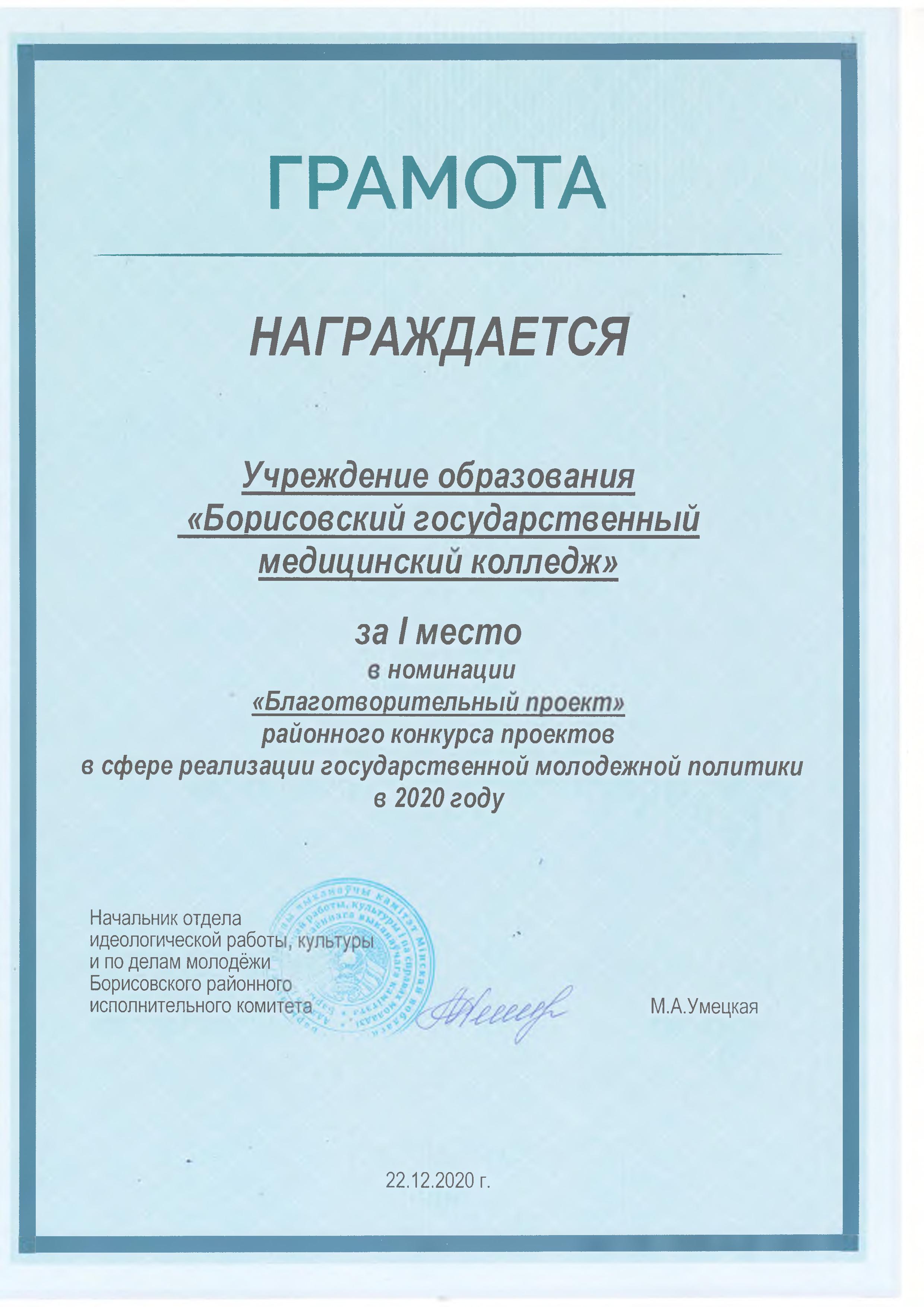 В декабре 2020 года отдел идеологической работы, культуры и по делам молодежи Борисовского райисполкома провел районный этап конкурса проектов в сфере реализации государственной молодежной политики. Волонтеры УО «Борисовский государственный медицинский колледж» приняли в нем активное участие.