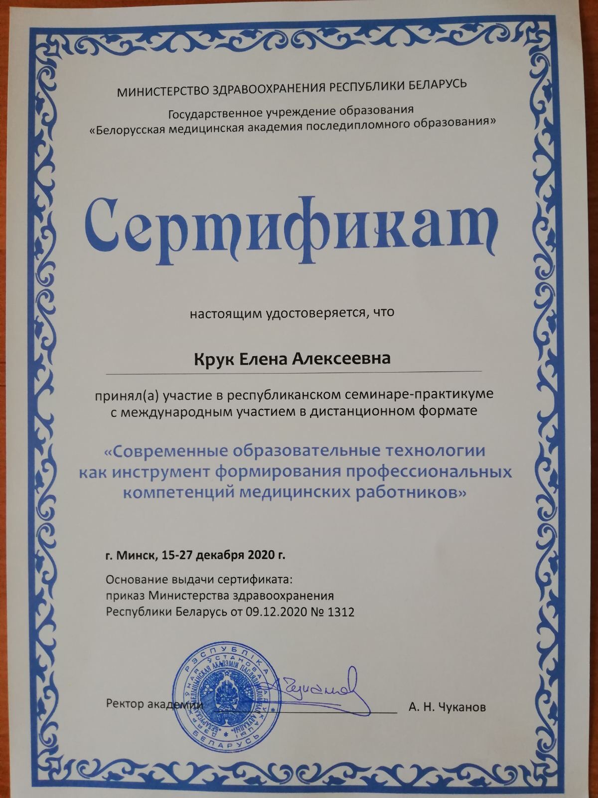 Наш колледж принял активное участие в проведении республиканского семинара-практикума "Современные образовательные технологии как инструмент формирования профессиональных компетенций медицинских работников". Семинар-практикум прошел в асинхронном онлайн-режиме. В облачное хранилище информации размещено видео с выступлением преподавателя Елены Крук по теме "Формирование профессиональной компетентности специалистов со средним специальным медицинским образованием при изучении учебных дисциплин общепрофессионального цикла".