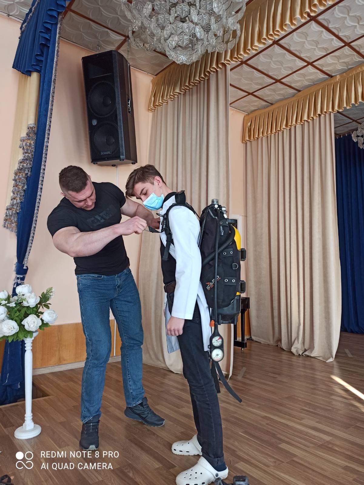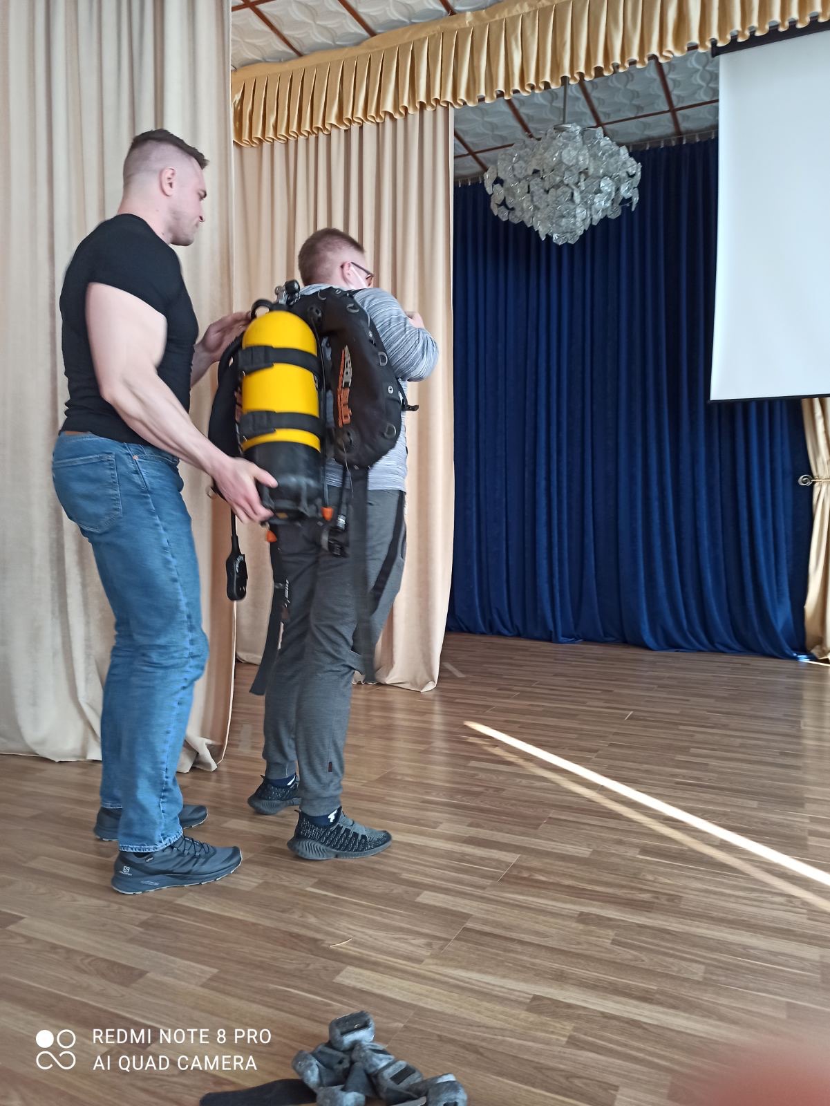 Наибольший интерес вызвала практическая часть встречи, на которой было представлено водолазное оснащение, и учащиеся смогли не только рассмотреть, но и примерить его на себя.