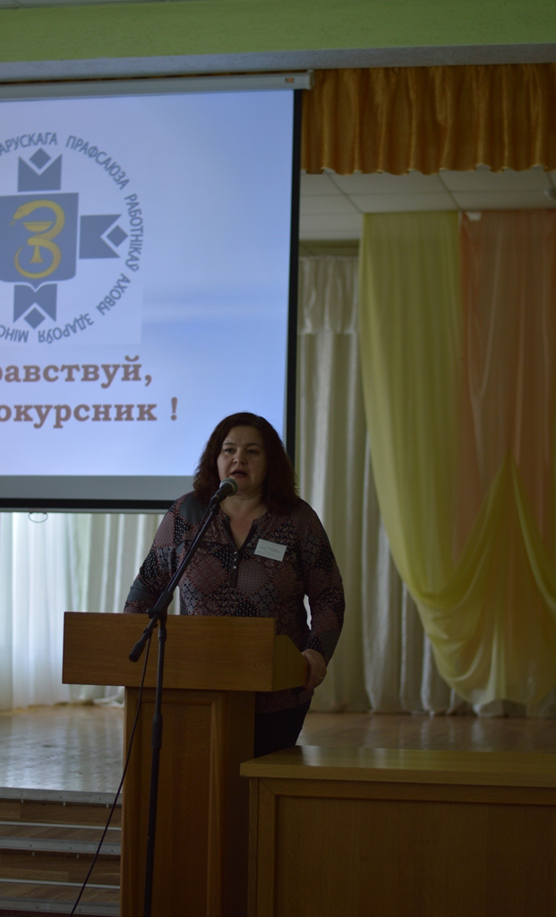Затем выступила Инна Кузьмицкая, главный специалист Минского областного комитета Белорусского профсоюза работников здравоохранения. Она отметила важные стороны деятельности профсоюза работников здравоохранения. Презентационно представила работу Минской областной организации Белорусского профсоюза работников здравоохранения, рассказала о молодежной политике и о проектах, реализуемых Минским областным комитетом и Молодежным Советом- в частности, «Активность – наша перспектива» и «Молодежный маршрут добрых дел». Затем прошла демонстрация видеоролика «О профсоюзе…», занявшего призовое место в конкурсе Минского областного объединения профсоюзов.