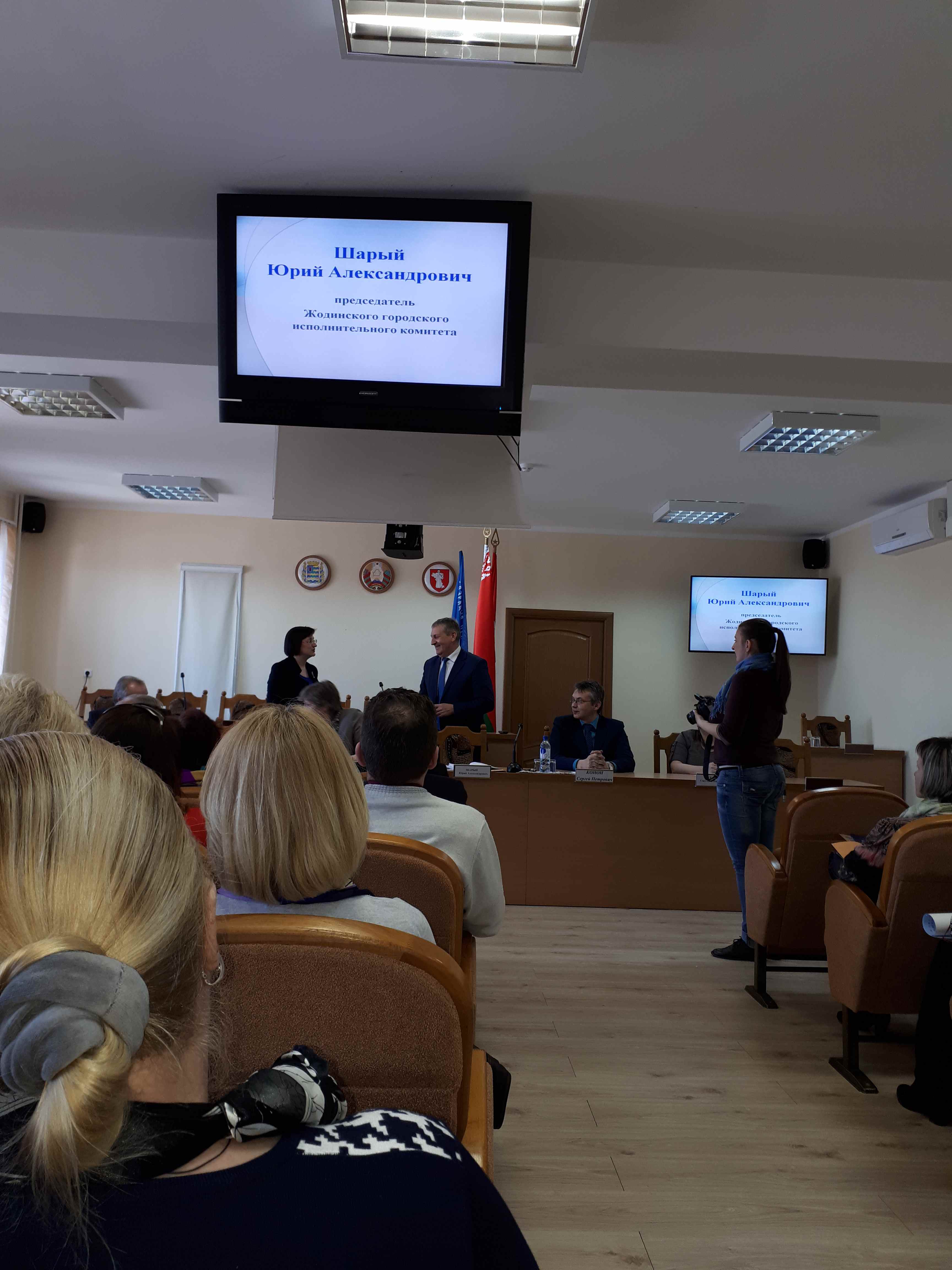 Высокую оценку работе профсоюзов дал в своем выступлении председатель Жодинского ГИК Юрий Шарый в деле защите законных интересов трудящихся, он также отчитался о проведенной работе, озвучил планы по благоустройству города в рамках проведения «Года малой Родины»: строительству нового 9 микрорайона в городе, новой детской поликлиники, благоустройству зон отдыха для горожан. Присутствующая на заседании заместитель председателя МООП Ксения Щедько вручила Юрию Шарому медаль «100 гадоу прафсаюзнага руху» и поблагодарила за сотрудничество и помощь профсоюзам города.