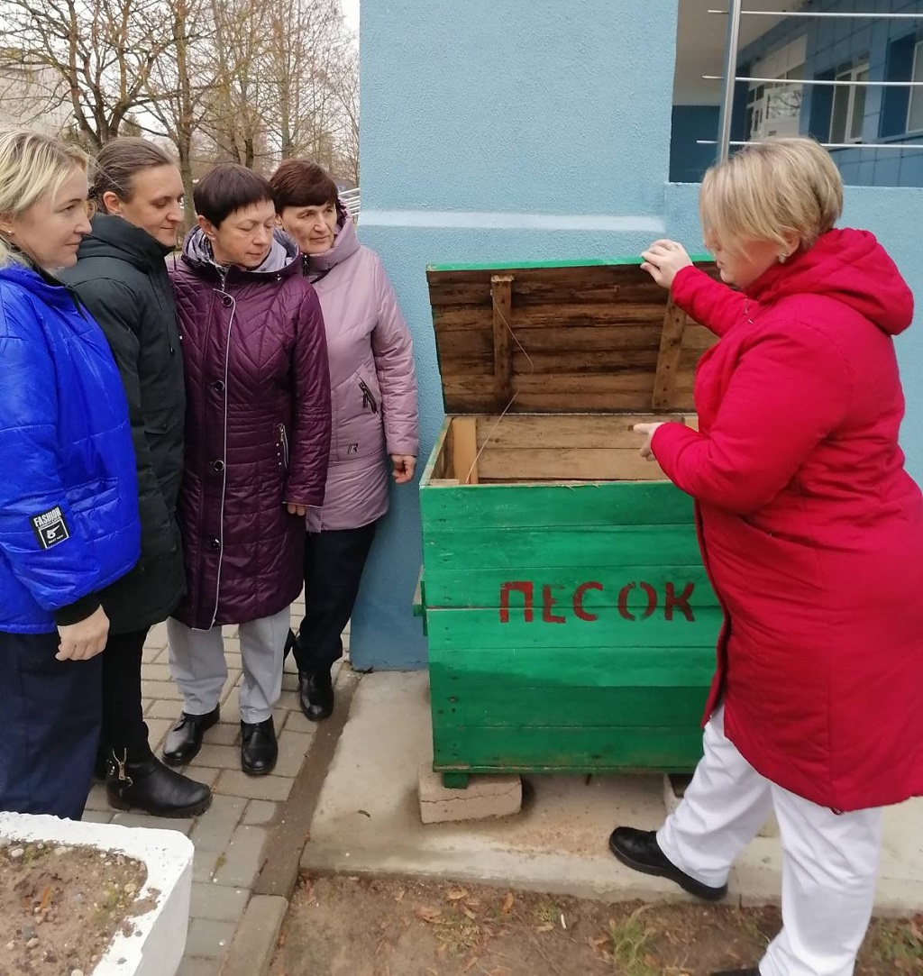 Профактив на территории больницы обозначил места, где необходимо соблюдать осторожность при движении в зимний период, проверил наличие песчаной смеси и ее запасы.