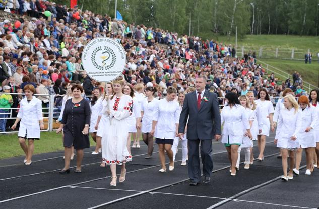 Праздничные мероприятия продолжилось на физкультурно-оздоровительном комплексе, где состоялось шествие более 30 трудовых коллективов учреждений, сельскохозяйственных и промышленных предприятий и организаций города и района.